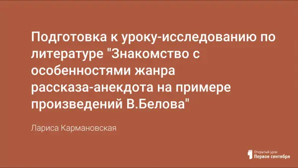 Рассказы-анекдоты В.И.Белова дают возможность работать над осмыслением особенностей юмора в художественных текстах, обучать основам филологического анализа, организуя на уроке проектную деятельность. Приводится методика исследования рассказа-анекдота «Маникюр»: сопоставление жанровых признаков анекдота через средства, рассмотренные на разных уровнях организации текста. Предложена технологическая карта подготовки к уроку в 9-м классе, где основная форма организации учащихся – работа в группе.