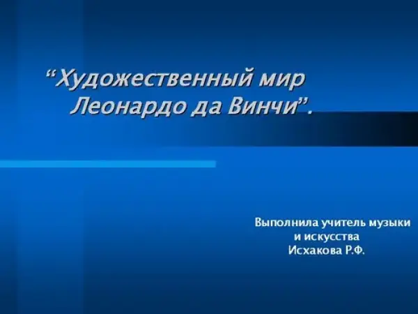 Цель урока: представить учащимся великих гениев эпохи Возрождения. Познакомить с самым ярким и запоминающимся (“визитными карточками”) произведениями творчества Леонардо да Винчи. Закрепить полученные знания в виде тестов.
