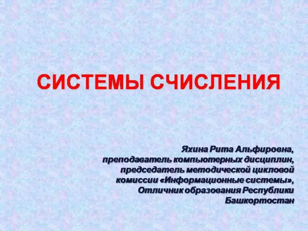 На уроке учащиеся знакомятся с понятием "системы счисления", вырабатывают навыки перевода чисел из одной системы счисления в другую. Презентацию урока можно использовать при объяснении нового учебного материала, составлении опорных конспектов, для повторения изученной темы, а также для самостоятельной и индивидуальной работы.