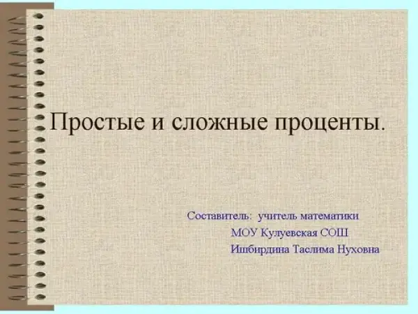 Вводный урок «Простые и сложные проценты» завершает тему главы «Арифметическая и геометрическая прогрессии». На уроке разбираются две задачи, в ходе решения которых применяются две различные схемы начисления процентов. В одном случае рассматриваемые суммы растут в арифметической прогрессии (начисляются простые проценты), в другом – геометрической прогрессии (начисляются сложные проценты).