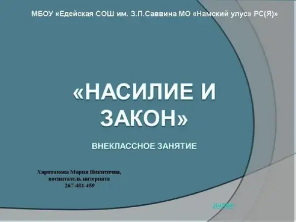 Внеклассное занятие «Насилие и закон» для воспитанников среднего звена дает представление о насилии, возможностях его предотвращения, законах, защищающих жертву.