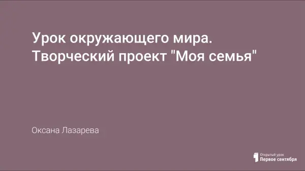 Предлагаемый урок показан в виде урока-отчета по изученному разделу «Семья», где ученики представляют свои творческие проекты, созданные самостоятельно и с помощью родителей в результате проделанной исследовательской работы. С целью осознания роли семьи в жизни человека, изучения истории своей семьи (родословной), рода занятий членов семьи, их хобби, семейных традиций и реликвий, родственных связей и отношений, понимания своей роли в семье.