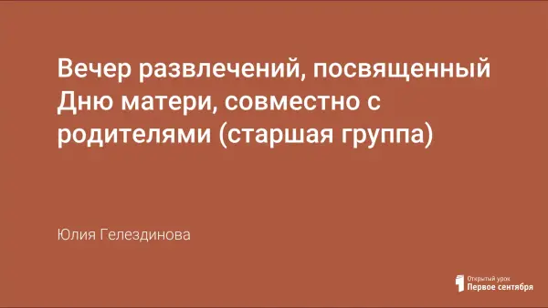 Материал предназначен для детей старшего возраста. Вечер развлечений может быть использован воспитателем без привлечения музыкального руководителя. Форма проведения вечера развлечений – командная игра, построенная на подвижных играх и играх малой подвижности, а также на играх развивающие творческие способности детей. Команды состоят из мамы и ребенка. Командная игра объединяет и способствует сплоченности мамы и ребенка.