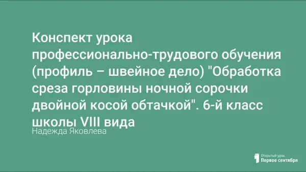 Урок профессионально-трудового обучения (профиль – швейное дело) в 6-м классе школы VIII вида практического повторения с использованием ИКТ проводится с целью усвоения технологической последовательности пошива изделия, закрепления приобретённых приёмов и навыков обработки выреза горловины ночной сорочки, развития способности самостоятельного выполнения задания, планирования предстоящей деятельности, оценки качества выполненной работы.