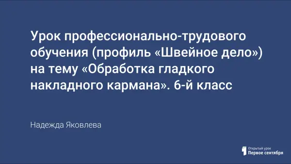 Урок знакомит учащихся с технологической последовательностью обработки гладкого накладного кармана, развитием способности самостоятельно выполнять практическое задание на основе образца и операционно-технологической карты, что впоследствии позволяет учащимся применять приобретенные умения и навыки при самостоятельном пошиве швейных изделий с гладкими накладными карманами.