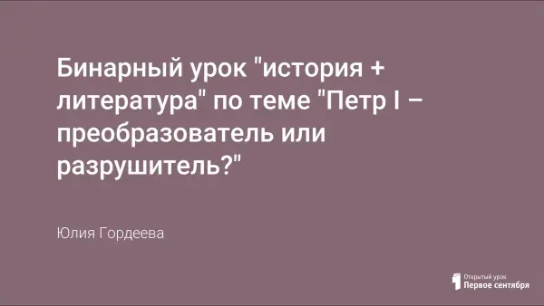 Тема Петра изучается на уроках истории, литературы (по роману А.Толстого «Петр I»). Автор объединила усилия двух предметов в изучении темы. Цель урока: дать нравственную оценку личности Петра I.