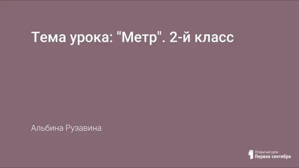 Цель урока – формирование способности учащихся к новому способу действия: использование единицы длины – метр. Расширение понятийной стороны за счет включения в нее нового элемента – метра (формирование представления о новой единице измерения – метре, способность к измерению длин с помощью метра, сравнению, сложению и вычитанию длин, выраженных в метрах, дециметрах и сантиметрах; совершенствование вычислительных навыков).