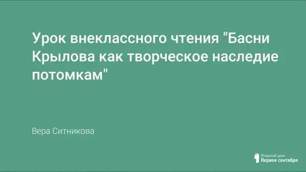 Урок внеклассного чтения «Басни Крылова как творческое наследие потомкам» расширяет и обобщает знания учащихся о жанре басни и творческом наследии Крылова. С этой целью предусматривается предварительная подготовка учащихся, разделенных на творческие группы, в результате работы которых под руководством учителя создаются мини-проекты с презентациями.