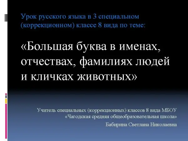 Цель урока: научится отличать имена собственные от нарицательных; самостоятельно формулировать правила употребления большой буквы в именах, отчествах, фамилиях и кличках животных; составлять предложения в правильной грамматической форме; обогащать активный и пассивный словарь.