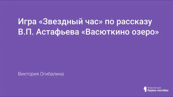 Игра «Звездный час» по рассказу В.П. Астафьева «Васюткино озеро» составлена в программе Microsoft PowerPoint. При появлении правильного ответа нужная картинка анимируется: мигает или увеличивается. В игру включены вопросы, которые обычно обсуждаются на уроках при изучении произведения.