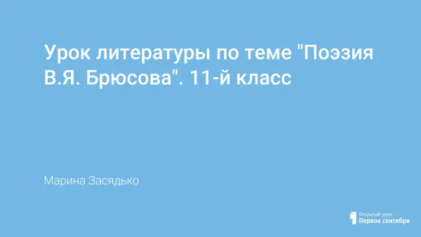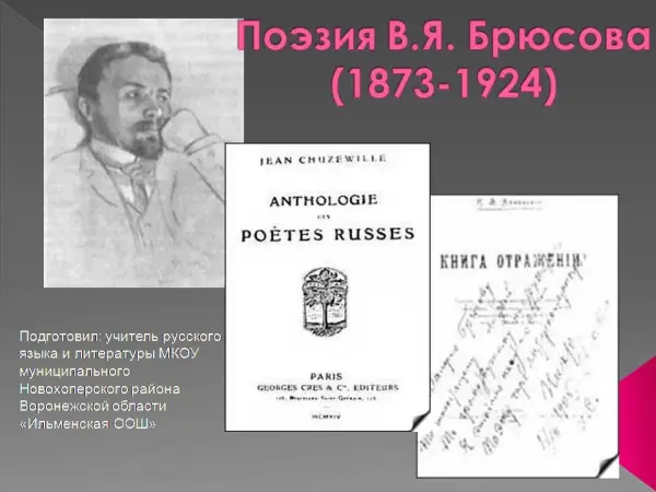 На уроке пойдет речь о творчестве В.Я. Брюсова. Новый материал представлен в виде доклада учащегося о биографии поэта и лекции учителя об особенностях творчества В.Я. Брюсова. Для того чтобы материал усваивался лучше, рассказ учителя сопровождается схемами. Наглядность играет большую роль в эффективном усвоении большого количества информации, такой, как биография и творческий путь поэта.
