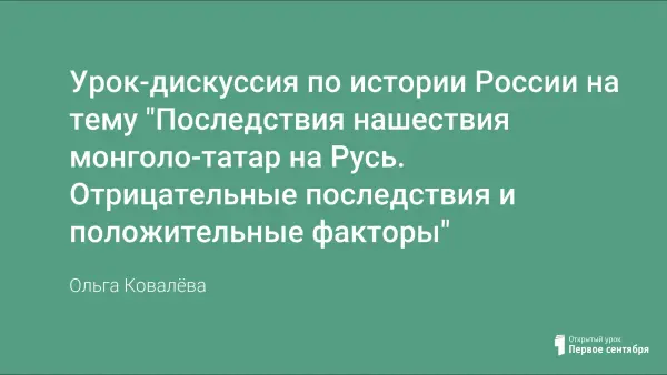 Урок проводится как закрепление изученного материала по общей теме "Русь под игом монголо-татар". Основная цель данного урока заключается в определении последствий нашествия и ига монголо-татар на дальнейшее развитие Руси. Учащиеся самостоятельно, на основе изучения исторических фактов и аргументов, выделяют последствия и влияние этого исторического факта на судьбу России.