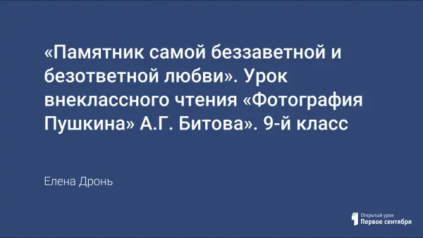 В ходе беседы, дискуссии и анализа избранных эпизодов повести А.Г. Битова «Фотография Пушкина» учащиеся составляют портрет Пушкина, делают вывод о его живом характере, чувстве юмора, мудрости, способности к гениальному прозрению судеб. Урок подводит учеников к мысли, что всеми поступками главного героя повести руководит любовь к поэту. Любовь и уважение к Пушкину водит и пером самого А.Г. Битова.