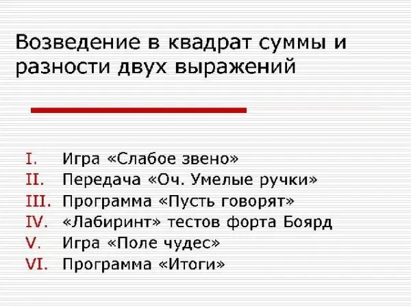 Цель урока: обобщить и систематизировать знания учащихся по данной теме; развивать навыки применения формул квадрата разности и квадрата суммы двух выражений.