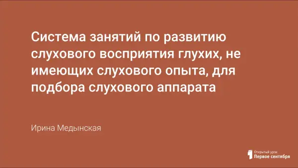 Система занятий по развитию слухового восприятия у глухих, не имеющих слухового опыта, является «плодом» многолетней работы сурдопедагога в определении либо накоплении минимального словаря для слухового восприятия у глухих, позволяющего оценить правильность подбора слухового аппарата. Таким образом, приведенная система является схемой, на которую может опираться сурдопедагог в своей работе по развитию слухового восприятия у глухих в медицинских учреждениях.