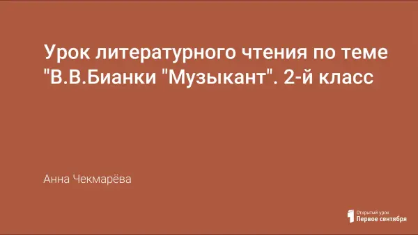 Урок знакомит учащихся с творчеством В.Бианки. В основу урока положено произведение В.В. Бианки «Музыкант». Учащиеся научатся прогнозировать содержание текста по его заглавию, читать вслух с постепенным переходом на чтение про себя, воспринимать на слух прочитанное; определять последовательность событий.