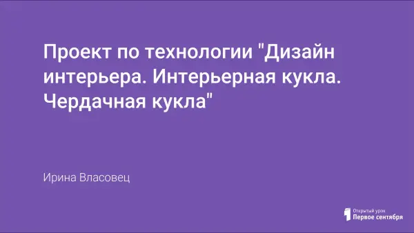 Целью в данной работе стояло создание чердачной куклы, в которой переплетаются древние и современные традиции русского народа. В работе проведено теоретическое исследование истории появления чердачной игрушки, история куклы и история интерьерной куклы: объединение новой техники с традициями старины. В результате работы создана чердачная кукла, которая является частью народной культуры и великолепно вписывается в любой интерьер. Работу отличают оригинальные детали, изготовленные вручную, которые подчеркивают народный колорит игрушки.