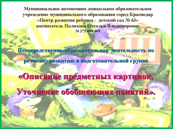 Занятие направлено на развитие и совершенствование лексико-грамматической стороны речи с целью уменьшения количества синтаксических ошибок в речи детей, уточнения и расширения лексических оттенков слов. Подобранный материал способствует расширению, уточнению и активизации словаря детей через углубление представлений о предметах, явлениях ближайшего и дальнего окружения ребенка, то есть за счет развития познавательной сферы.
