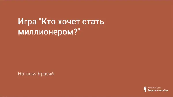 Урок служит расширению кругозора учащихся и популяризации знаний в рамках общеобразовательных дисциплин, формированию умения использовать полученные знания в игровой ситуации, воспитанию активной жизненной позиции и уверенности в своих знаниях. Представлен один тур игры из разработанных семи.