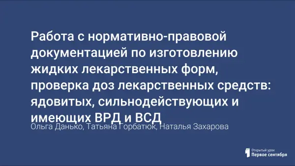 Цель занятия: формирование у студентов умений использовать нормативную документацию по изготовлению и внутриаптечному контролю жидких лекарственных форм (ЖЛФ), оценивать качество изготовленных лекарственных форм, читать и переводить англоязычную научную и учебную литературу, содержащую основные фармацевтические понятия и термины.