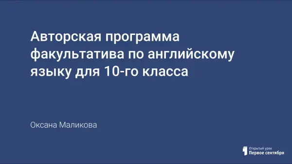 Авторская программа факультатива по английскому языку предназначена для учащихся 10-го класса. Она составлена со всеми необходимыми требованиями и ориентирована на интересы, нужды обучающихся, позволяет качественно подготовить учеников к сдаче ЕГЭ.