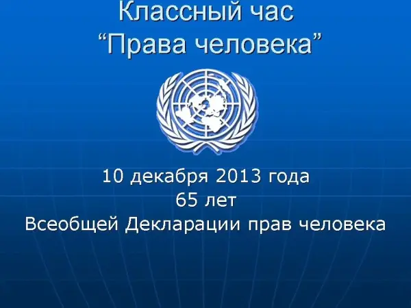 Внеклассное мероприятие для учащихся 3-х классов посвящено 65-летию принятия Всеобщей декларации прав человека ООН. Учащиеся в игровой форме узнают о правах и свободах, которые гарантирует Декларация. Классный час способствует воспитанию терпимости, взаимопонимания и уважения к правам других, развивает навыки участия в дискуссии.