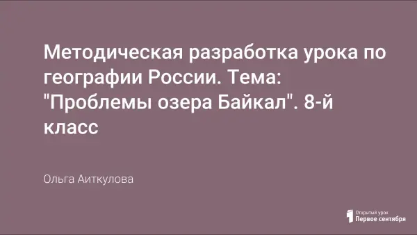 Методическая разработка по географии разработана согласно учебной программы для 8-го класса. В работе отражены основные этапы урока и его методическое сопровождение в виде электронной презентации. Материал урока предусматривает подробное изучение природных особенностей озера Байкал, выявление экологических проблем и пути их решения. Для развития самостоятельной деятельности учащихся, запланирована проектная работа и определены темы.