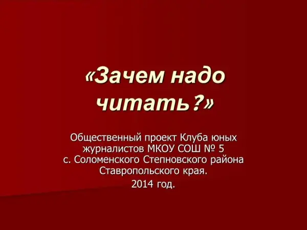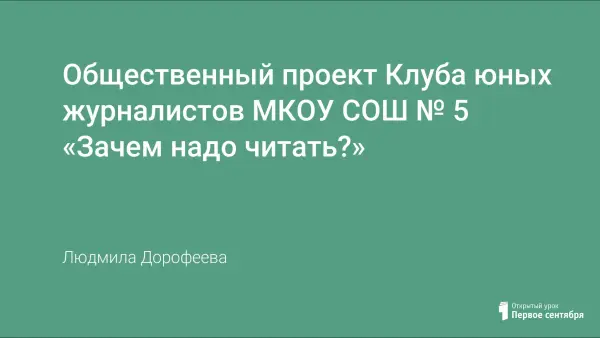 В настоящее время можно говорить о кризисе чтения в нашей стране. Перестав читать, современная молодежь перестает анализировать, рассуждать, мыслить. Растет духовно бедное поколение. Надо, чтобы молодежь задумалась над тем, что она теряет, отказываясь от чтения художественной, публицистической литературы. Работа над проектом призвана мотивировать их к чтению, поэтому этот вопрос интересен для юных журналистов.