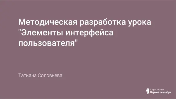 Методическая разработка занятия по теме «Элементы интерфейса пользователя» составлена с учетом требований ФГОС СПО 3-го поколения. На занятии продемонстрирована возможность использования технических средств обучения для контроля знаний, при объяснении нового учебного материала, для закрепления знаний. С использованием ТСО организован самоконтроль знаний обучающимися.