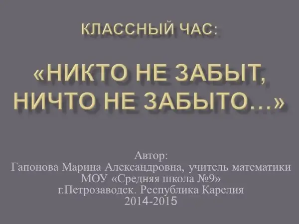 Цели классного часа: дать информацию о войне, выяснить какое участие в ней принимали жители Карелии; сформировать у учащихся чувство гражданственности, патриотизма, ответственности за судьбу Отечества, готовности к ее защите.
