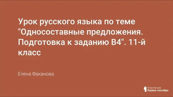 Урок повторения материала, изученного в 8-м классе, разработан с целью успешной подготовки к выполнению задания В4 в формате ЕГЭ по русскому языку. Отрабатываются умения не только находить в тексте односоставные предложения, указанного вида, но и различать от двусоставного полного и неполного. В результате деятельностного подхода обучающиеся в течение всего урока совершенствуют умения в систематизировании материала на определенную тему, в соотношении явления и понятия.