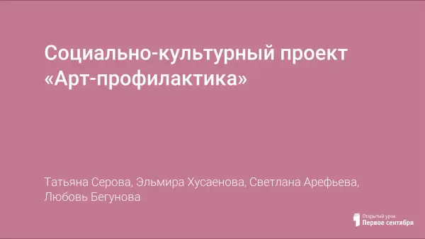 Проект посвящен активизации профилактической работы асоциального поведения учащихся и родителей в Детской художественной школе № 1 города Набережные Челны. Проект имеет социальное и практическое значение для обогащения содержания профилактической работы по сохранению жизни, здоровья и психического благополучия учащихся.