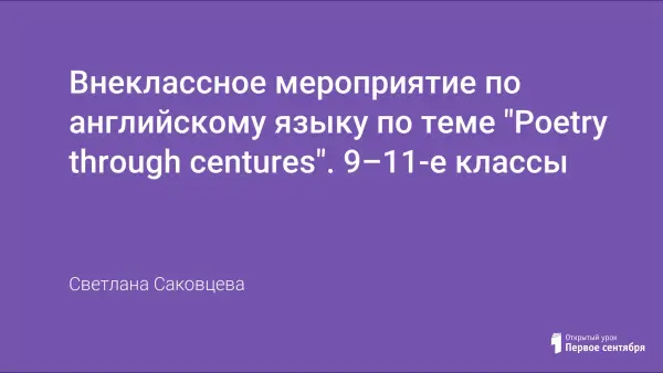 Внеклассное мероприятие по английскому языку “Poetry through centures” построено в форме литературного вечера, развивает активное, прочувственное и осознанное восприятие школьниками образцов британской и американской поэзии, приобщает к литературному наследию стран изучаемого языка, повышает интерес к предметам “Английский язык” и “Русская литература”.