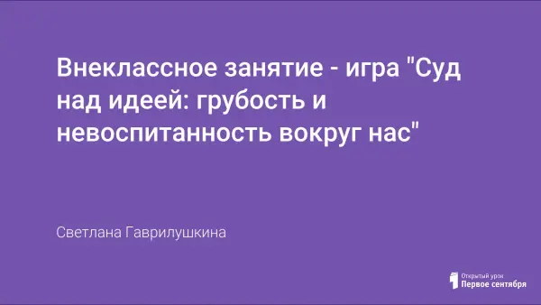 Занятие-игра проходит с использованием технологии дебаты. Возраст детей: 4–6-й класс. Цель игры: познакомить учащихся с понятиями «дебаты», «суд», раскрыв эти понятия; приобщать школьников к анализу и оценки нравственных явлений; вырабатывать умения выражать и отстаивать личную позицию, бороться с несправедливостью; воспитание яркой, критически мыслящей личности, способной противостоять стереотипам; формирование коммуникативной и ораторской культуры.