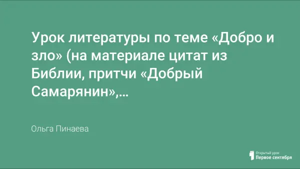 Конспект урока по литературе в аспекте требований ФГОС ОО для 7–9-х классов на материале цитат из Библии, притчи «Добрый Самарянин», высказываний Святых Отцов, басен поэта Пинаева А.К. «Бездушный», «Щенок и Ослик». Цель урока: формирование представлений о добре и зле. Планируемые предметные результаты: способствовать правильному представлению учащихся о добре и зле; раскрыть христианское понимание основных категорий «добра» и «зла»; повышать общую культуру личности.