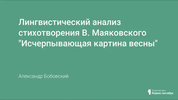 В статье рассматривается актуальный вопрос организации лингвистического анализа текста на уроках литературы в основной школе. Автор статьи приводит пример лингвистического анализа мини-стихотворения В.Маяковского «Исчерпывающая картина весны» (1913). Такого рода анализ стихотворения может быть проведен на уроке, который предшествует рассмотрению более крупного и сложного произведения автора.