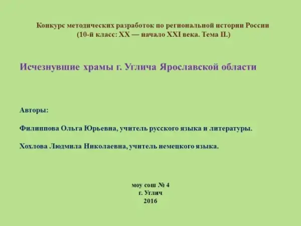 Цель работы: привлечение внимания обучающихся к историческому прошлому своей страны, к исчезнувшим храмам г.Углича Ярославской области. Материал работы позволяет узнать историю пятнадцати исчезнувших церквей города Углича и познакомиться с местами, на которых в начале прошлого века эти церкви стояли. Статья содержит материал об архитектурных особенностях исчезнувших храмов. Презентацию можно предложить учителям на уроках МХК и ИЗО при изучении архитектурных стилей.