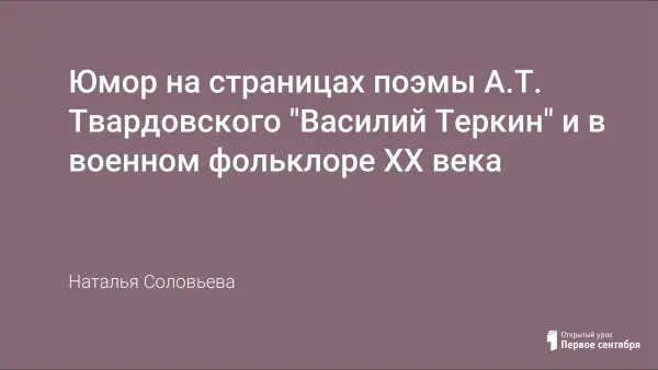 Урок-концерт раскрывает идейно-тематическую, художественную значимость юмора в поэме А.Твардовского «Василий Тёркин», знакомит с жанрами военного фольклора 40-х годов XX века (частушки, песни, солдатская бывальщина, пословицы, поговорки). Развивается умение анализировать текст, определять идейно-тематическую, композиционную, изобразительно-выразительные особенности. Урок направлен на воспитание чувства гордости за славное прошлое Отчизны, любви к малой родине.