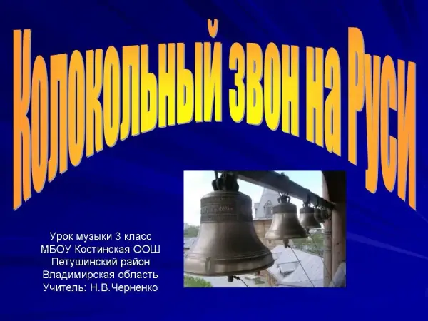 Урок музыки по теме адресован учащимся 3-го класса. На уроке ученики знакомятся с историей колоколов, их назначением. Урок сопровождается прослушиванием музыкальных фрагментов звучания колоколов, просмотром видеофрагмента колокольного звона и презентацией.
