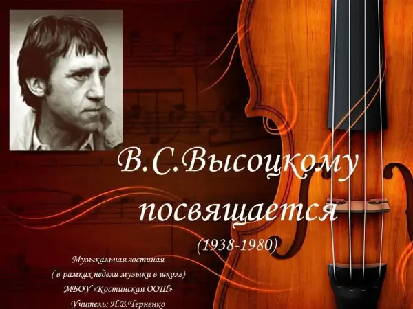 Мероприятие сопровождается прослушиванием музыкальных фрагментов, просмотром видеофрагментов и презентацией. Цель урока: приобщение слушателей к миру музыкального искусства, знакомство с авторской песней, творчеством В.С. Высоцкого; пробуждение эмоциональной отзывчивости учащихся; развитие духовного мира.