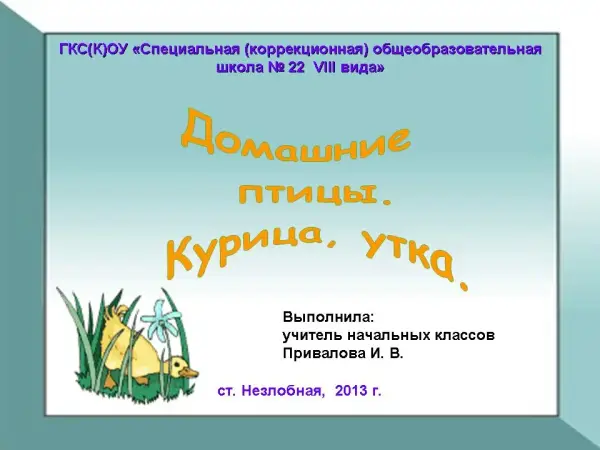 Урок развития речи на основе изучения предметов и явлений окружающей действительности формирует представления учащихся о курице и утке как домашних птицах, совершенствует речевые навыки детей. Для закрепления полученных знаний в ходе урока предусмотрена работа с конструктором ПервоРобот LEGO® EducationWeDo™*9580, что повышает мотивацию учащихся с ограниченными возможностями здоровья к обучению.