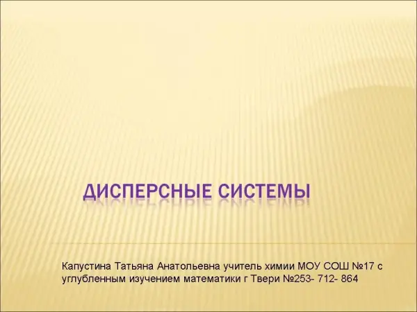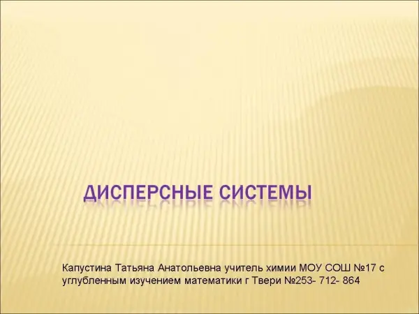 Понятие "дисперсные системы" вводится впервые в курсе изучения химии, хотя важно для расширения представлений учащихся о формах существования вещества. Для понимания материала необходимо, чтобы учащиеся имели наглядное представление о видах и особенностях дисперсных систем. Большое внимание уделяется иллюстративному материалу, представленному в презентации.