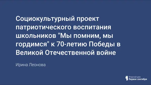 Проект развивает нравственно-патриотические качества личности ребенка, любовь к Родине, преданность, ответственность и гордость за нее. В проекте представлен цикл мероприятий, посвященных событиям, в которых в полной мере проявился героизм и патриотизм русских людей в Великой Отечественной войне.