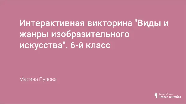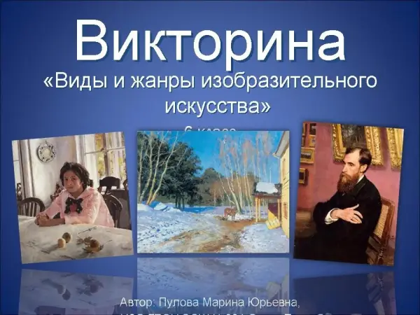 Викторина «Виды и жанры изобразительного искусства» представляет собой увлекательную интерактивную игру. В игровой форме раскрывается картина систематизации знаний учащихся по видам и жанрам изобразительного искусства. Такую викторину можно применить и во внеурочной деятельности. Она актуальна в коллективе, индивидуальной работе с ребенком (например, учеником домашнего обучения).