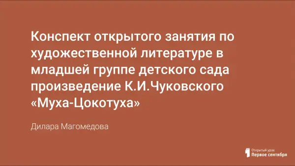 Цели занятия: познакомить детей с новым художественным произведением К.И.Чуковского (сказка К.Чуковского «Муха-Цокотуха»); формировать у детей интерес к слушанию художественного произведения; привлекать к рассказыванию отрывков произведения с опорой на картинки; способствовать формированию интереса к книгам.