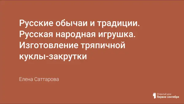Формирование представлений о духовных истоках русского народа и его самобытности, открытие глубины идей и красоты славянских обычаев и традиций; сформировать умения по изготовлению куклы-закрутки. Создать условия для выбора нравственного ориентира погружением в традиционную культуру русского народа, воспитывать чувство гордости за русские обычаи и традиции.