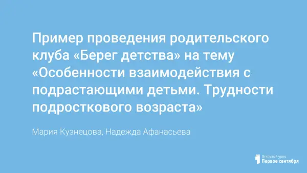 Пример проведения родительского клуба «Берег детства» на тему «Особенности взаимодействия с подрастающими детьми. Трудности подросткового возраста»