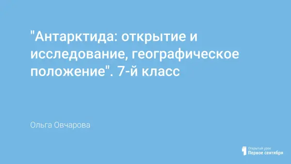 Данный урок географии с использованием презентации предназначенный для учащихся 7-го класса имеет обзорный характер: знакомство с первооткрывателями Антарктиды, характеристика географического положения материка, влияние географического положения на природу континента. В ходе урока учащиеся совершенствуют умения работы с картой, учатся выявлять причинно-следственные связи, формируют познавательный интерес к географии, развивают патриотические чувства.