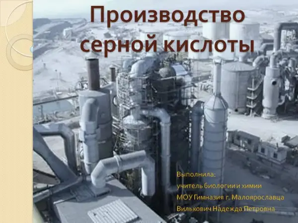 В части описания химического производства серной кислоты материал учебника недостаточен, и поэтому большую роль играет презентация по теме. Излагает материал о химическом производстве и ставит акценты на самых важных моментах при изучении любого производства, повышает интерес учащихся к изучаемому вопросу.