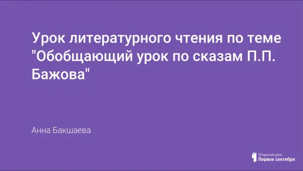 Обобщающий урок внеклассного чтения посвящен сказам П.П. Бажова. Уроку предшествует предварительная работа: изучение биографии П.П. Бажова, чтение произведений писателя. Цель занятия: обобщить знания учащихся о П.П. Бажове и его сказах, развивать познавательную активность детей, образное мышление, речь, память; прививать любовь к родному краю, чувство уважения и благодарности к тем, кто славит его своим трудом.